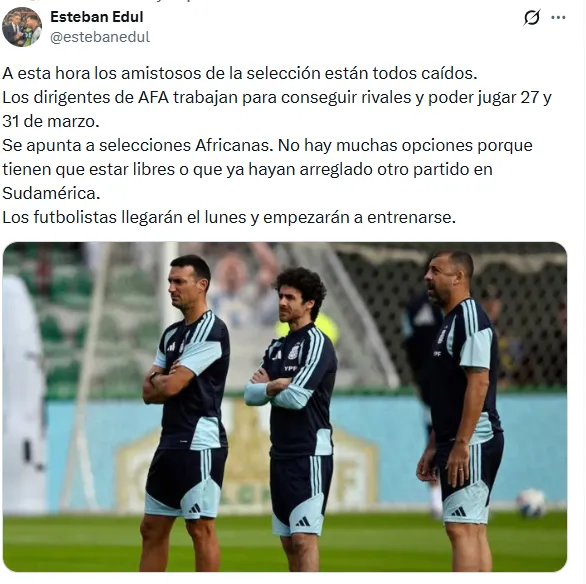 El periodista de ESPN Argentina, Esteban Edul, confirmó que “los amistosos de la selección están todos caídos“. Con esta novedad, la Azul y Blanco jugaría únicamente su encuentro contra Argelia programado para el próximo 27 de marzo en Turín, Italia.