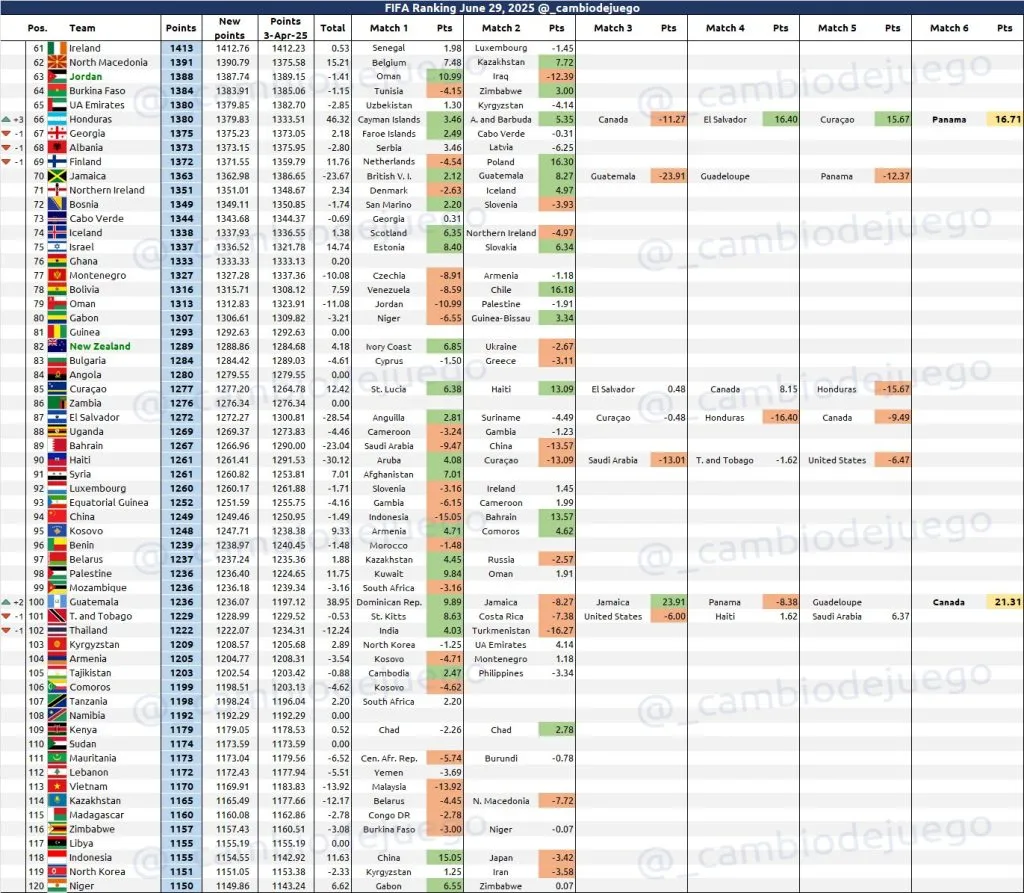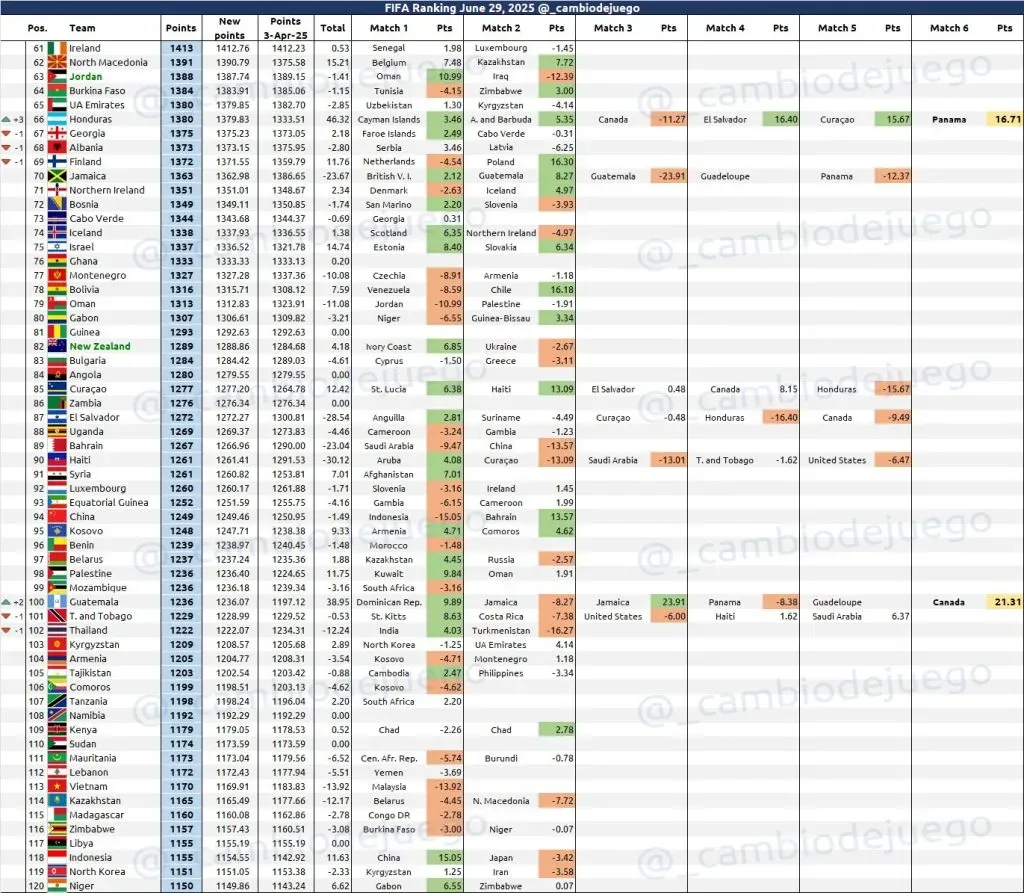 Gracias a esta clasificación histórica, Guatemala recuperó un lugar ante la FIFA que había perdido años atrás. Con el empate ante Canadá, la Bicolor volverá al top 100 del Ranking FIFA. Según los datos que aportó la cuenta Cambio de Juego, el seleccionado chapín dejará el puesto 102 y superará a Tailandia y Trinidad y Tobago cuando finalice la Copa Oro.
