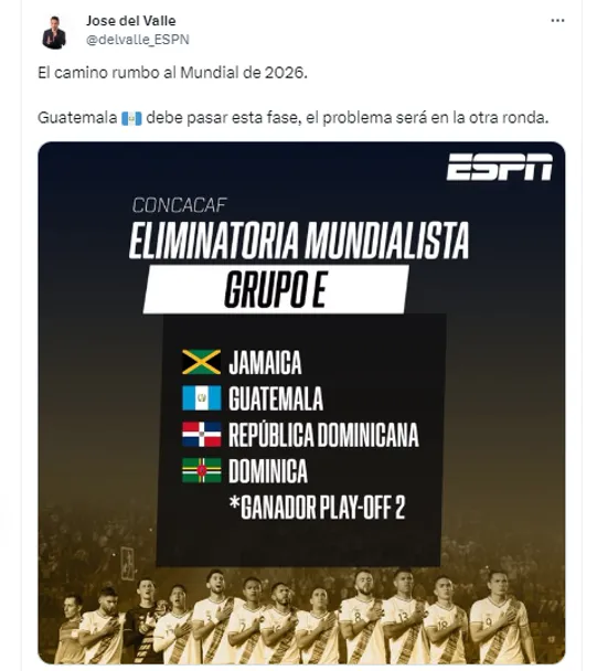 A través de su cuenta oficial de X, el periodista guatemalteco José del Valle expresó lo siguiente: “El camino rumbo al Mundial de 2026. Guatemala debe pasar de fase, el problema será en la otra ronda”, sentenció