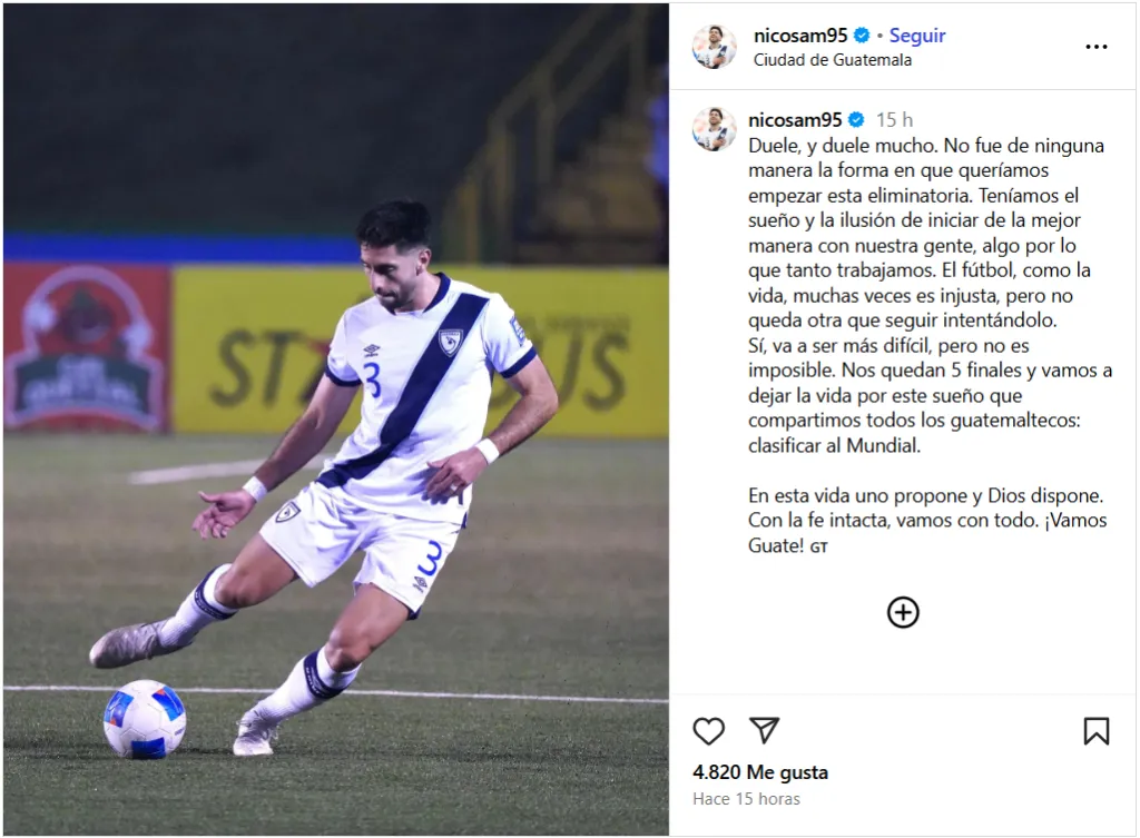“Sí, va a ser más difícil, pero no es imposible. Nos quedan 5 finales y vamos a dejar la vida por este sueño que compartimos todos los guatemaltecos: clasificar al Mundial. En esta vida uno propone y Dios dispone. Con la fe intacta, vamos con todo. ¡Vamos Guate!”, sentenció el defensor con ese mismo posteo realizado.