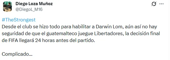 Desde Bolivia, el periodista Diego Loza Muñoz agregó que The Strongest hizo todo para habilitar al delantero chapín. Sin embargo, podría no contar con él. “La decisión final de FIFA llegará 24 horas antes del partido“, confirmó sobre el futuro de Lom.