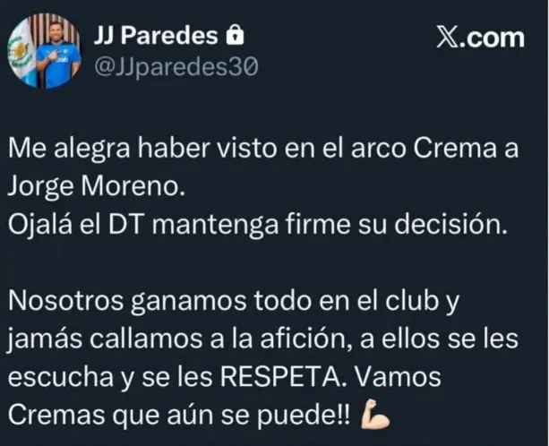 Con la autoridad de haberlo ganado todo con el club, Paredes fue claro: “Nosotros ganamos todo en el club y jamás callamos a la afición, a ellos se les escucha y se les RESPETA. Vamos Cremas que aún se puede“. Sus palabras rápidamente generaron eco entre los seguidores del equipo albo.