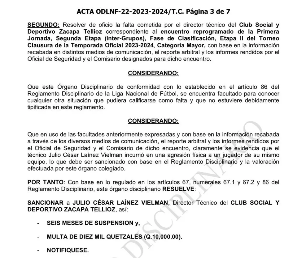 El Órgano Disciplinario de la Liga Nacional recibió este jueves el acta arbitral del partido de Zacapa vs Comunicaciones, donde era de esperarse se adjuntaría lo sucedido por parte del entrenador, por lo que era inevitable que recibiera una sanción digna, aunque al final no fue así.