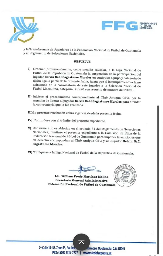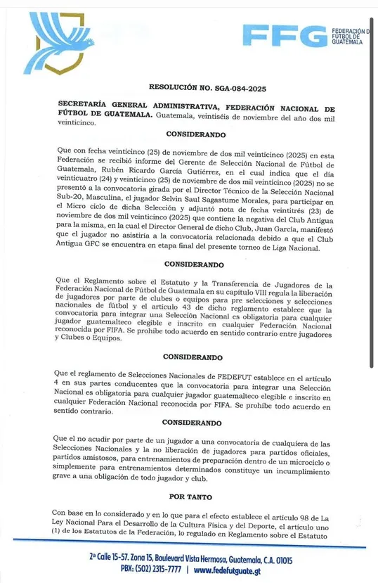 En la resolución oficial, la FEDEFUT establece claramente: «Iníciese el procedimiento correspondiente al Club Antigua GFC, por la negativa de liberar al jugador Selvin Joel Sagastume Morales para atender la convocatoria que le fue realizada». El documento añade que esta acción constituye una falta directa al reglamento de selecciones nacionales.