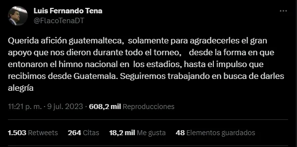“Querida afición guatemalteca, solamente para agradecerles el gran apoyo que nos dieron durante todo el torneo, desde la forma en que entonaron el himno nacional en los estadios, hasta el impulso que recibimos desde Guatemala. Seguiremos trabajando en busca de darles alegría“, el mensae que dejó Tena en su cuenta de Twitter.