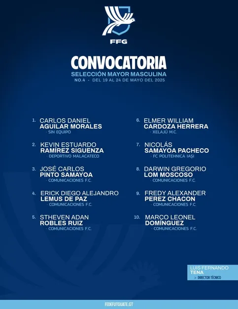 Aunque este viernes, Tena dio más novedades, al dar una nueva convocatoria, pero ahora de 10 jugadores, en las que se confirmó el regreso de Darwin Lom de los cremas y Elmer William Cardoza de Xelajú MC.