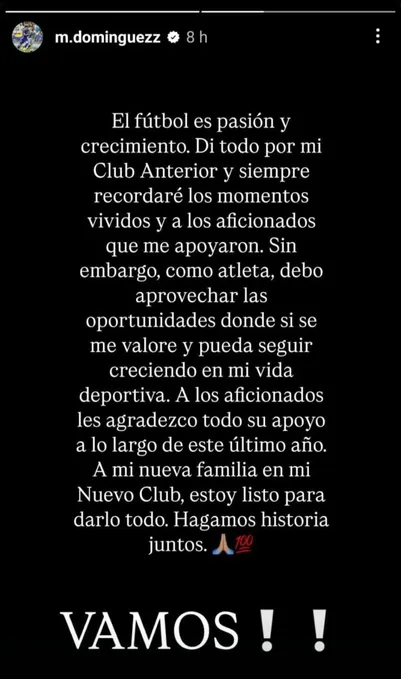 “El futbol es pasión y crecimiento. Di todo por mi Club Anterior y siempre recordaré los momentos vividos y a los aficionados que me apoyaron. Sin embargo como atleta, debo aprovechar las oportunidades donde si se me valore y pueda seguir creciendo en mi vida deportiva”, arrancó.