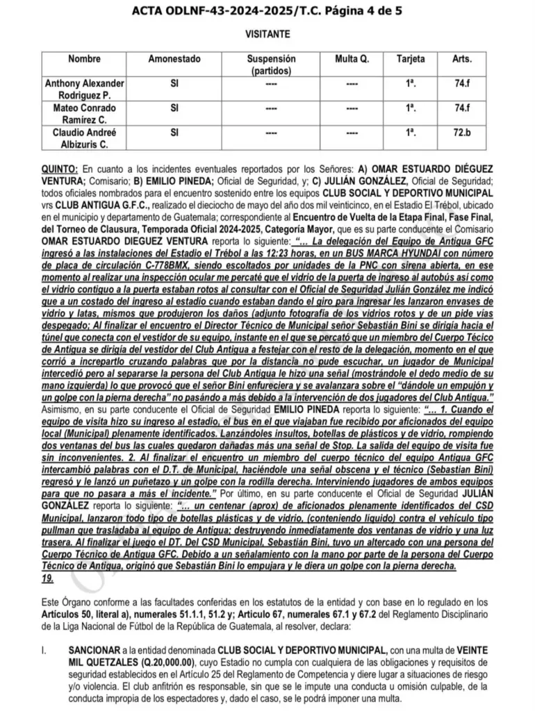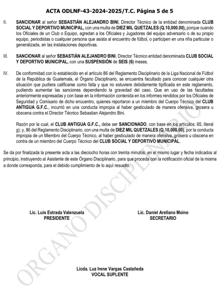 Según anunció este martes a través de las redes sociales, el ente autónomo “decidió imponer una multa de 10 mil quetzales y una sanción de seis meses al técnico de Municipal, Sebastián Alejandro Bini, por agresión a miembro del cuerpo técnico del equipo adversario”.