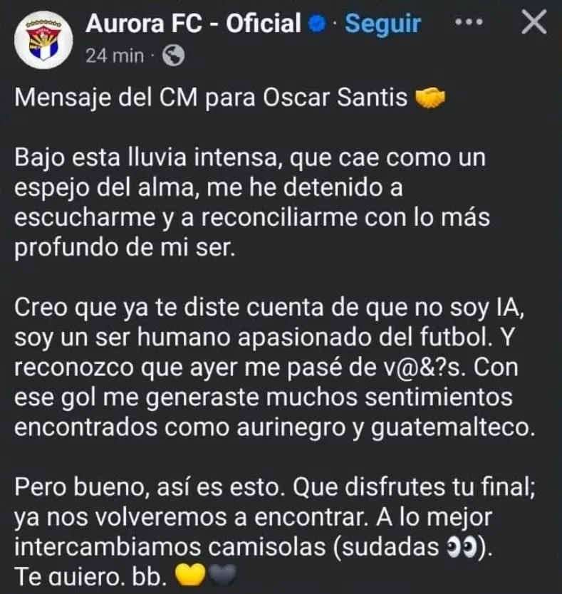 “No soy una IA, soy un ser humano apasionado del fútbol”, expresa parte del comunicado, en el que el encargado de redes admite que “se pasó de la raya” y que el gol de Santis le generó sentimientos encontrados tanto como aurinegro como guatemalteco. El mensaje concluye deseándole éxito en la final y dejando abierta la puerta a un futuro reencuentro deportivo.