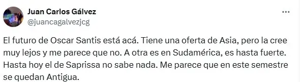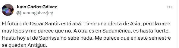 “El futuro de Óscar Santis está acá. Tiene una oferta de Asia, pero la cree muy lejos y me parece que no. Otra es en Sudamérica, es hasta fuerte. Hasta hoy, del Saprissa no se sabe nada. Este semestre se queda en Antigua“, sentenció el reportero.