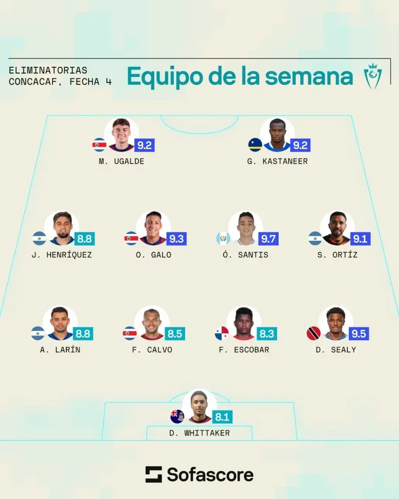 Según la valoración de Sofascore, sitio de estadísticas, Santis integra el equipo de la semana de la fecha 4 de las Eliminatorias Concacaf. Con 9.7, el delantero chapín fue el que más puntuación obtuvo.
