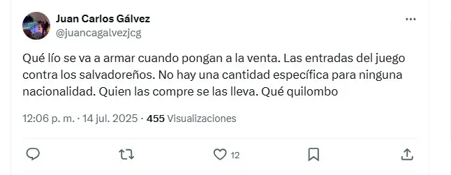 La Federación de Guatemala no daría ninguna cantidad específica para ningún seleccionado ni tampoco prioridades para la afición chapina. “Quien las compre se las lleva. Qué quilombo“, agregó el periodista guatemalteco.