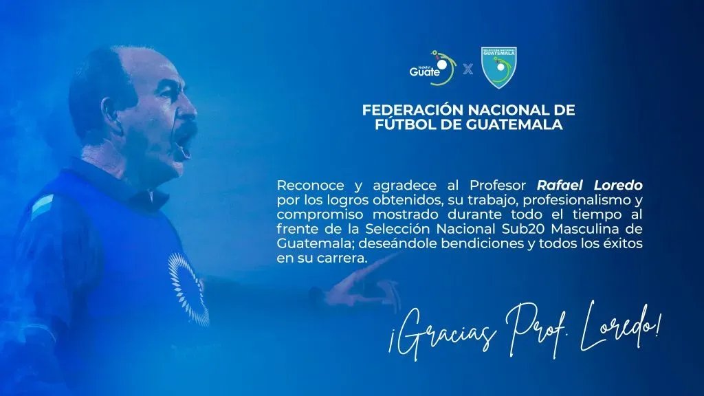 “#Fedefut Reconoce y agradece al Prof. Rafael Loredo, su trabajo, profesionalismo y compromiso mostrado durante todo el tiempo al frente de la Selección Nacional Sub20 Masculina Guatemala, deseándole bendiciones en sus próximos proyectos. #VamosGuate“, redactó el ente.