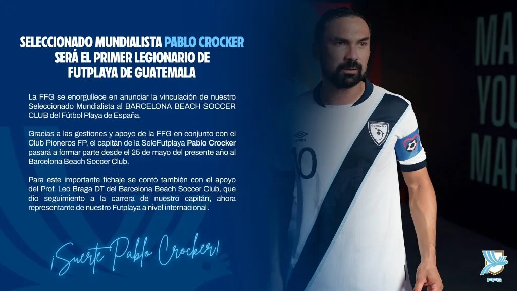 “La FFG se enorgullece en anunciar la vinculación de nuestro seleccionado mundialista al Barcelona Beach Soccer Club del Futbol Playa de España. Gracias a las gestiones y apoyo de la FFG en conjunto con el Club Pioneros FP, el capitán de la SeleFutplaya, Pablo Crocker, pasará a formar parte desde el 25 de mayo del presente año al Barcelona Beach Soccer Club“, aseguró la Federación.