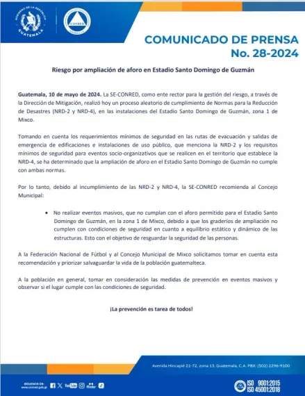 Es por eso que Conred emitió un comunicado dirigido a la Liga Nacional y Federación de Futbol de Guatemala para que no se jugara, esto a menos de 24 horas del encuentro, pero dichos entes manifestaron que autorizaron la impresión de 10 mil boletos, pero con la condición que Mixco y sus representantes se responsabilicen ante cualquier inconveniente.