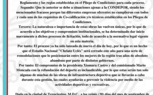 POR TANTO: El compromiso de la presidenta Xiomara Castro y del comisionado Mario Moncada con la refundación del deportes es inclaudicable, por lo que estas serán tan solo algunas de muchas obras de infraestructura deportiva que se llevarán a cabo durante esta gestión, las cuales ayudarán a prevenir la violencia por medio de las actividades deportivas y recreativas, finalizó el comunicado lanzado en las redes sociales de CONDEPOR.