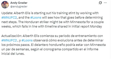 “Actualización: Alberth Elis está comenzando su período de entrenamiento trabajando con MNUFC2, y los Loons verán cómo va eso antes de determinar los próximos pasos. El delantero hondureño podría estar con Minnesota por un par de semanas, lo que encaja con la línea de tiempo compartida en el informe inicial del lunes”.