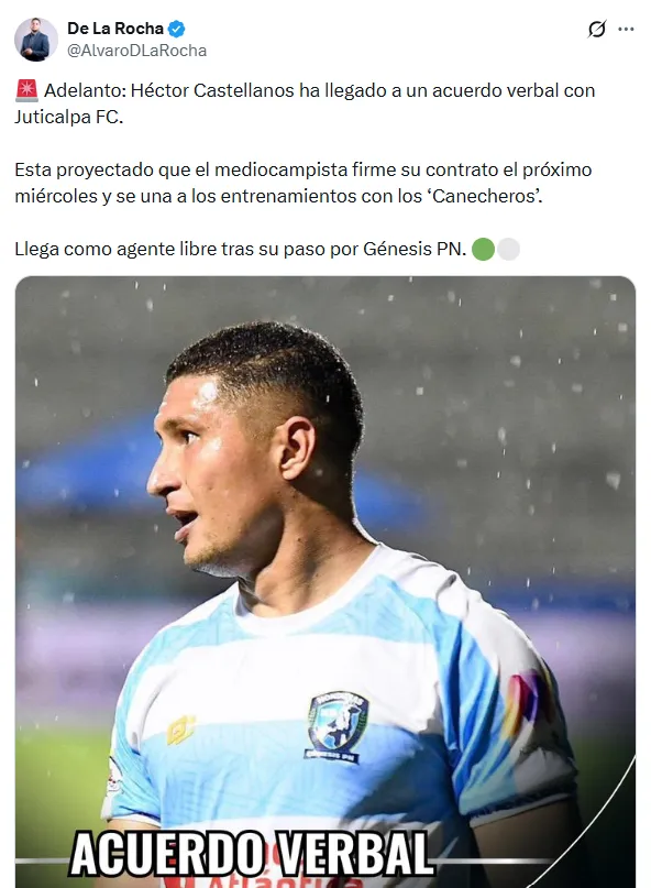 “Héctor Castellanos ha llegado a un acuerdo verbal con Juticalpa FC. Está proyectado que el mediocampista firme su contrato el próximo miércoles y se una a los entrenamientos de los ‘canecheros’. Llega como agente libre tras su paso por Génesis PN”, escribió el periodista.