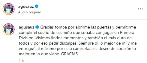 El argentino mandó este mensaje en sus redes sociales: “Gracias Tomba por abrirme las puertas y permitirme el sueño de ese niño que soñaba con jugar en primera división. Vivimos momentos lindos y también el más duro de todos y por eso pedir disculpas. Siempre di lo mejor se mí y me entregué al máximo por esta camiseta. Les deseó lo mejor en lo que vienen. GRACIAS”.