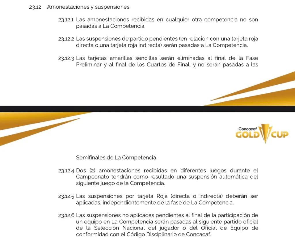 “Las suspensiones no aplicadas pendientes al final de la participación de un equipo en La Competencia serán pasadas al siguiente partido oficial de la Selección Nacional del jugador o del Oficial del Equipo de conformidad con el Código Disciplinario de Concacaf.”