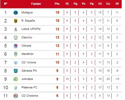 Con este empate, Real España perdió el primer lugar con Motagua y, ahora por diferencia de goles, ocupa la segunda posición. En puntos, ambos equipos están igualados con 19 unidades.