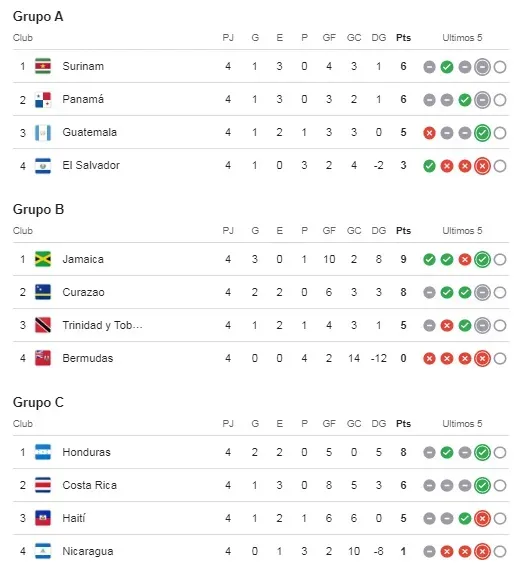 Honduras suma 8 unidades sobre 6 de Costa Rica, en los otros grupos la ventaja es de 1 (caso de Jamaica -9- sobre Curazao -8-) y Panamá que iguala en unidades (6) con Surinam.