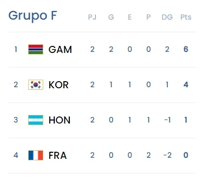 De esta manera, Gambia y Corea del Sur encabezan el Grupo F, los africanos con 6 puntos y los asiáticos con cuatro unidades, ya con un pie en los octavos de final. Honduras es tercero con un punto y Francia última con cero unidades, ambas buscarán el pase a la siguiente fase el domingo 25 de mayo.