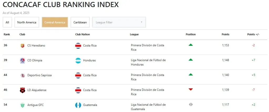 Como es de costumbre, cada semana Concacaf actualiza el ranking de Centroamérica. En esta ocasión Alajuelense fue el más perjudicado y Olimpia el beneficiado.
