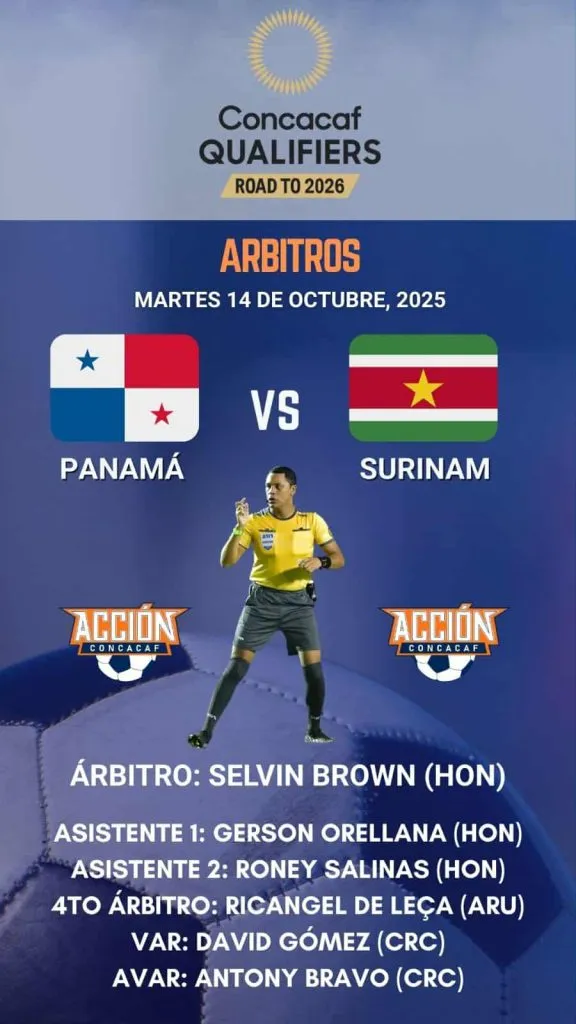 El martes 14 de octubre se dará el enfrentamiento entre Panamá y Surinam, para ese día el hondureño Selvin Brown pitará el cotejo en el estadio Rommel Fernández Gutiérrez.
