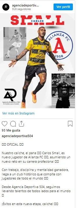 “Carlos Small es nuevo jugador de Alianza FC, asumiendo un nuevo reto en su carrera profesional. Con trabajo, disciplina y mentalidad competitiva, el delantero panameño llega a un club histórico del fútbol salvadoreño, habituado a competir al más alto nivel. Desde Agencia Deportiva 504, continuamos impulsando el talento hacia nuevas oportunidades internacionales. Éxitos a Carlos Small en esta nueva etapa de su carrera”, escribió la agencia.