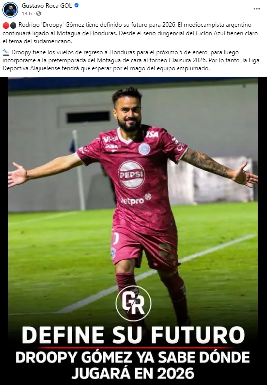 Droopy tiene los vuelos de regreso a Honduras para el próximo 5 de enero, para luego incorporarse a la pretemporada del Motagua de cara al torneo Clausura 2026. Por lo tanto, la Liga Deportiva Alajuelense tendrá que esperar por el mago del equipo emplumado”, informa Gustavo Roca, periodista hondureño que maneja muy buena información de Motagua.
