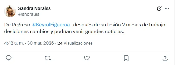 “De regreso Keyrol Figueroa, después de una lesión de dos meses de trabajo, decisiones, cambios y podrían venir grandes noticias”, escribió Norales.
