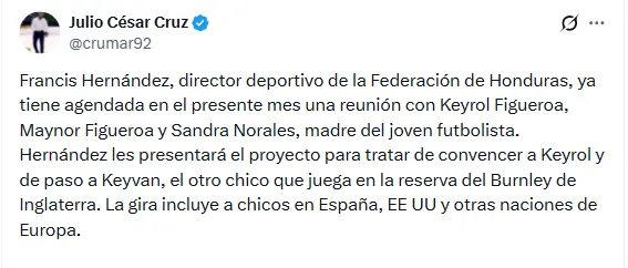 “Francis Hernández, director deportivo de la Federación de Honduras, ya tiene agendada una reunión con Keyrol Figueroa, Maynor Figueroa y Sandra Norales, madre del joven futbolista”, escribió Cruz en su cuenta de X.