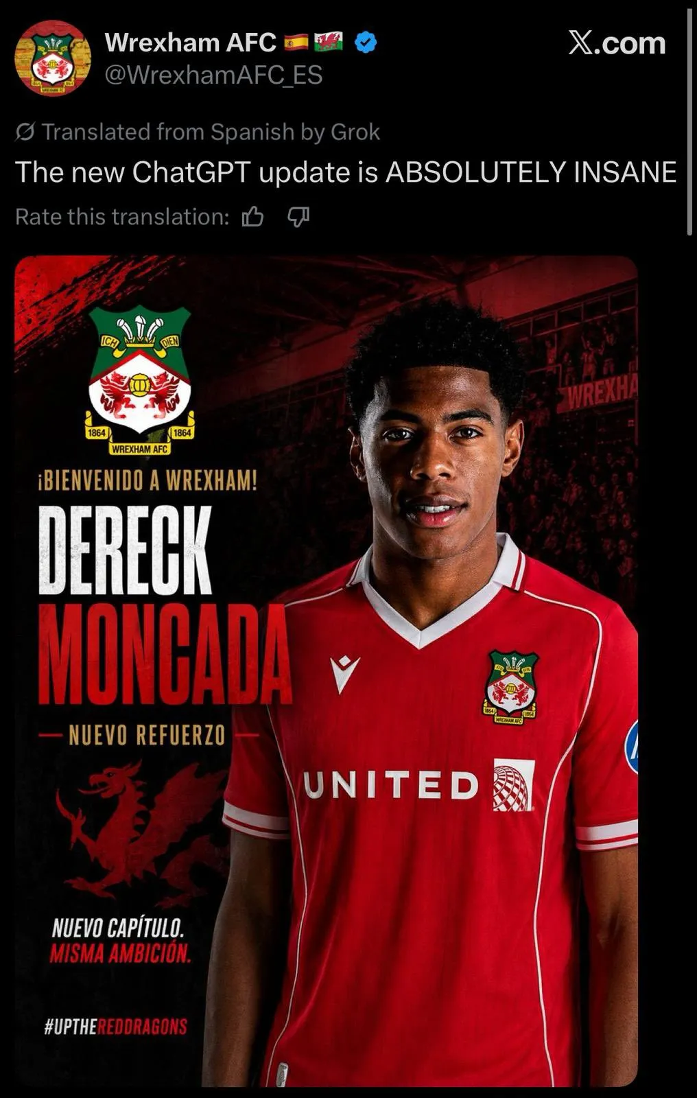 La euforia ha llegado a niveles insospechados. En las últimas horas, se ha vuelto viral una supuesta confirmación del fichaje generada a través de ChatGPT. Los seguidores del club británico no solo piden su llegada, sino que ya “fantasean” con el anuncio oficial, utilizando herramientas de inteligencia artificial para visualizar a Moncada vistiendo la camiseta de los “Dragones Rojos”.