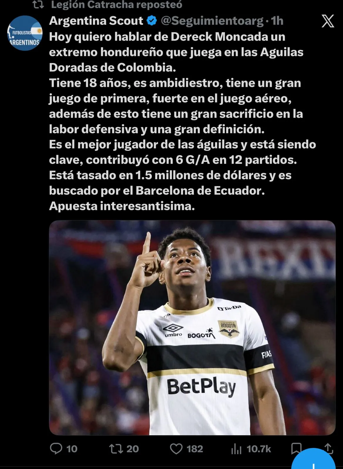 “Hoy quiero hablar de Dereck Moncada, un extremo hondureño que juega en el Águilas Doradas de Colombia. Tiene 18 años, es ambidiestro, tiene un gran juego de primera, fuerte en el juego aéreo; además de esto, tiene un gran sacrificio en la labor defensiva y una gran definición”, comienza diciendo la publicación que inmediatamente los aficionados corrigieron sobre el club para el que juega el hondureño.