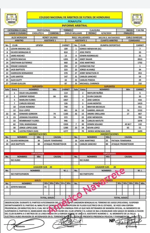 “Se hizo una espera prudencial (20 minutos) en el cual no se restableció la energía por lo que nos retiramos de manera oficial. Al momento de suspender el partido el marcador era a favor del club UPNFM y el juego se iba a reanudar con saque de banda a favor del Club Olimpia a 5 metros de la línea media en la banda donde se ubica el asistente número 2”, agregó el silbante.