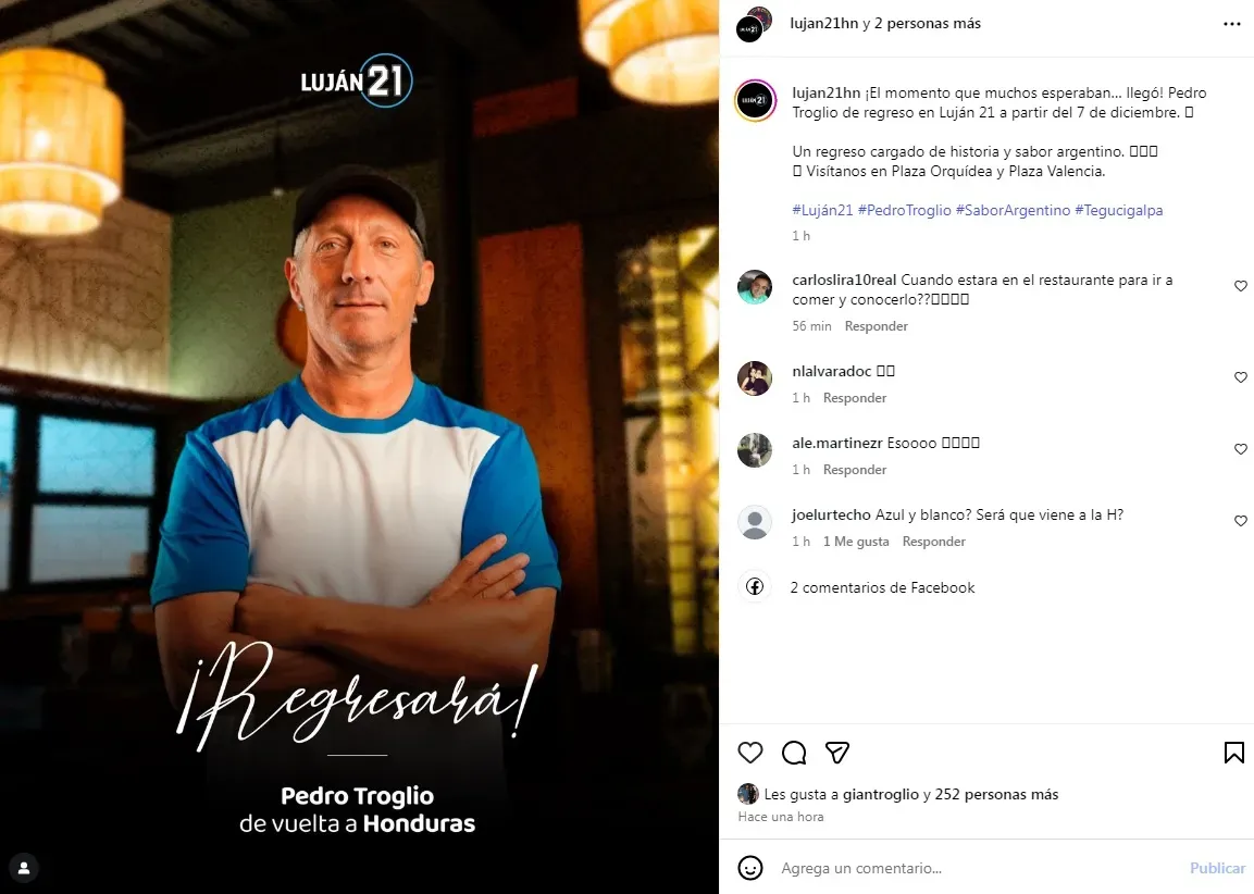 Visítanos en Plaza Orquídea y Plaza Valencia”, fue el anuncio de Luján 21, restaurante que tiene Troglio en Tegucigalpa, capital de Honduras.