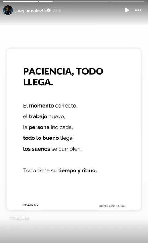 Rosales compartió una imagen que dice como titular: “Paciencia, todo llega“. Y con ello también una frase que es rotundad para su situación.