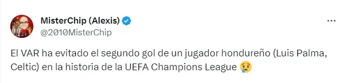 Como ya es tradicional, el estadígrafo español Martín Alexis Tamayo, más conocido como Míster Chip, dio a conocer un dato que nadie esperaba y que evitó que Palma entrara en la historia: “El VAR ha evitado el segundo gol de un jugador hondureño (Luis Palma, Celtic) en la historia de la UEFA Champions League”