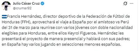“Francis Hernández, director deportivo de la Federación de Fútbol de Honduras (FFH), aprovechará el viaje a España por el amistoso contra Perú el 31 de marzo para reunirse con varios jóvenes con doble nacionalidad, elegibles para Honduras, entre ellos Keyrol Figueroa. Hernández les presentará el proyecto de manera presencial y hablará con sus padres. En España, hay varios jugadores en selecciones menores españolas.”