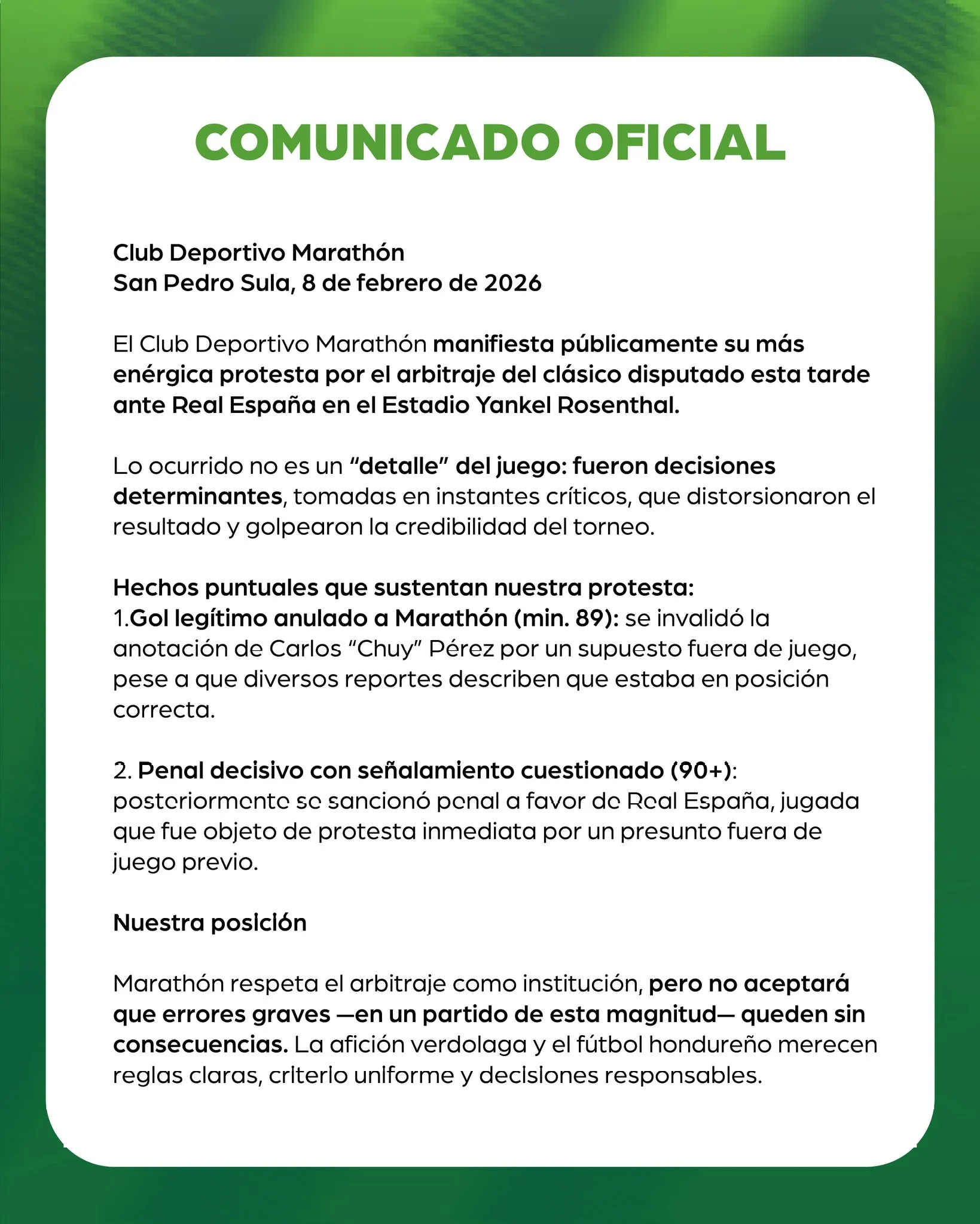 Marathón respeta el arbitraje como institución, pero no aceptará que errores graves -en un partido de esta magnitud- queden sin consecuencias. La afición verdolaga y el fútbol hondureño merecen reglas claras, criterio uniforme y decisiones responsables.