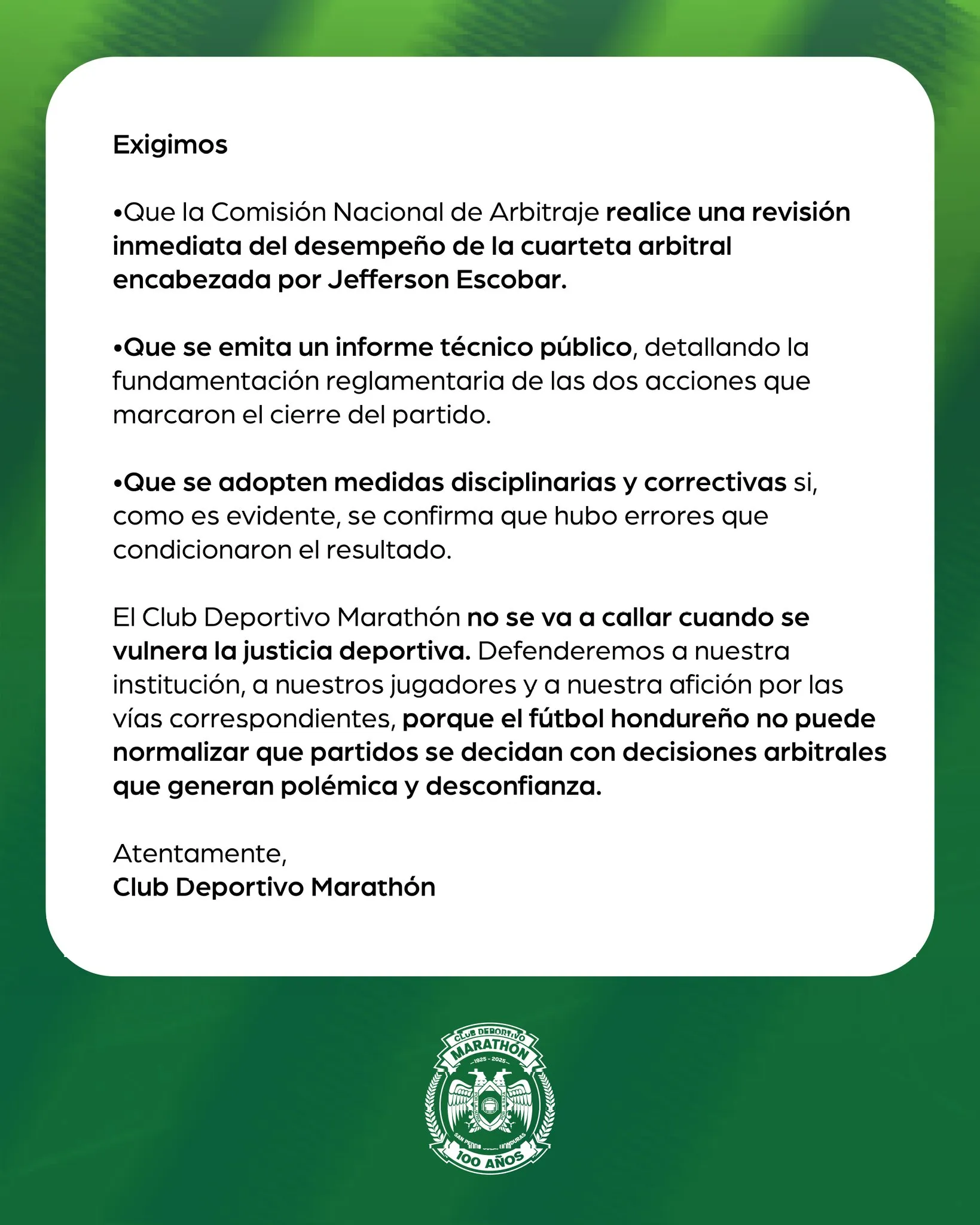 El Club Deportivo Marathón no se va a callar cuando se vulnera la justicia deportiva. Defenderemos a nuestra institución, a nuestros jugadores y a nuestra afición por las vías correspondientes, porque el fútbol hondureño no puede normalizar que partidos se decidan con decisiones arbitrales que generan polémica y desconfianza.