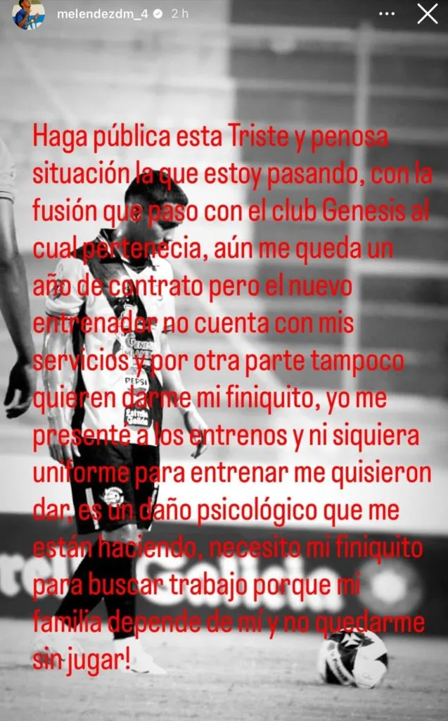“Hago pública esta triste y penosa situación que estoy pasando, con la fusión que pasó con el club Genesis al cual pertenecía, aún me queda un año de contrato, pero el nuevo entrenador no cuenta con mis servicios, por otra parte tampoco quieren darme mi finiquito.