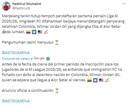 “Antes de la fecha de cierre del primer período de inscripción para los jugadores de la M League 2025/26, se entiende que Imigresen FC ha fichado con éxito al delantero nacido en Colombia, Wilmar Jordan Gil, quien se espera que llegue a Alor Setar el viernes”, informan.