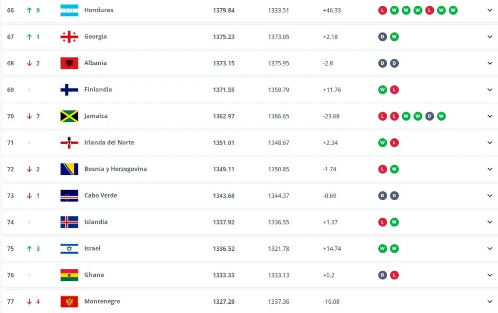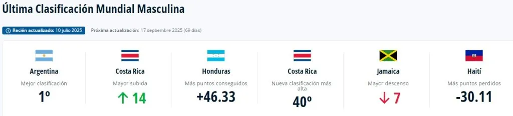 Honduras sumó un total de +46.33 y se ubica en el puesto 66. Escaló 9 puestos y aprovechó la bajada de Jamaica que descendió 7 unidades.