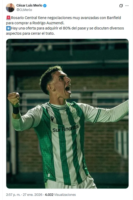 “Rosario Central tiene negociaciones muy avanzadas con Banfield para comprar a Rodrigo Auzmendi. Hay una oferta para adquirir el 80% del pase y se discuten diversos aspectos para cerrar el trato”, escribió el periodista César Merlo.