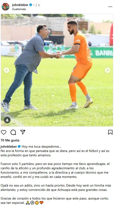 Con un mensaje en sus redes sociales John Kleber confirmó que dejará a Achuapa de manera precipitada.