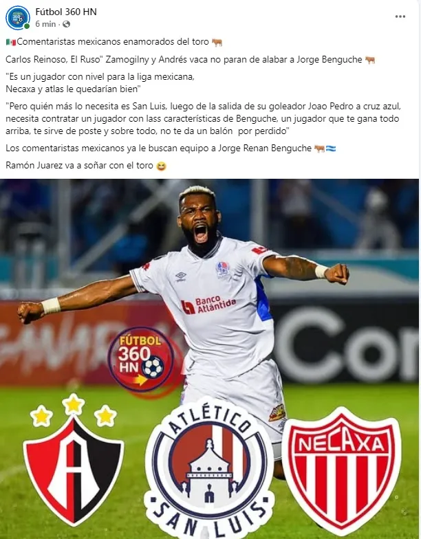 “Necaxa y Atlas le quedarían bien, pero quién más lo necesita es San Luis, luego de la salida de su goleador Joao Pedro a Cruz Azul, necesita contratar un jugador con las características de Benguche, un jugador que te gana todo arriba, te sirve de poste y sobre todo, no te da un balón por perdido”.