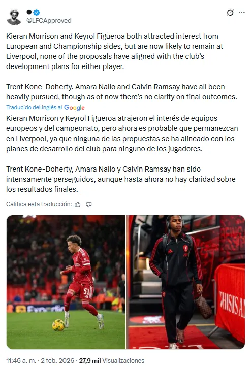 “Personalmente, creo que el Liverpool está interesado en evitar que Morrison, Figueroa y Kone-Doherty sean cedidos a entornos externos mientras sus situaciones contractuales aún se están negociando. Desde la perspectiva del club, el control y la seguridad futura importan más que los minutos limitados que tiene el jugador senior en un club cedido en estos momentos”, añadió.