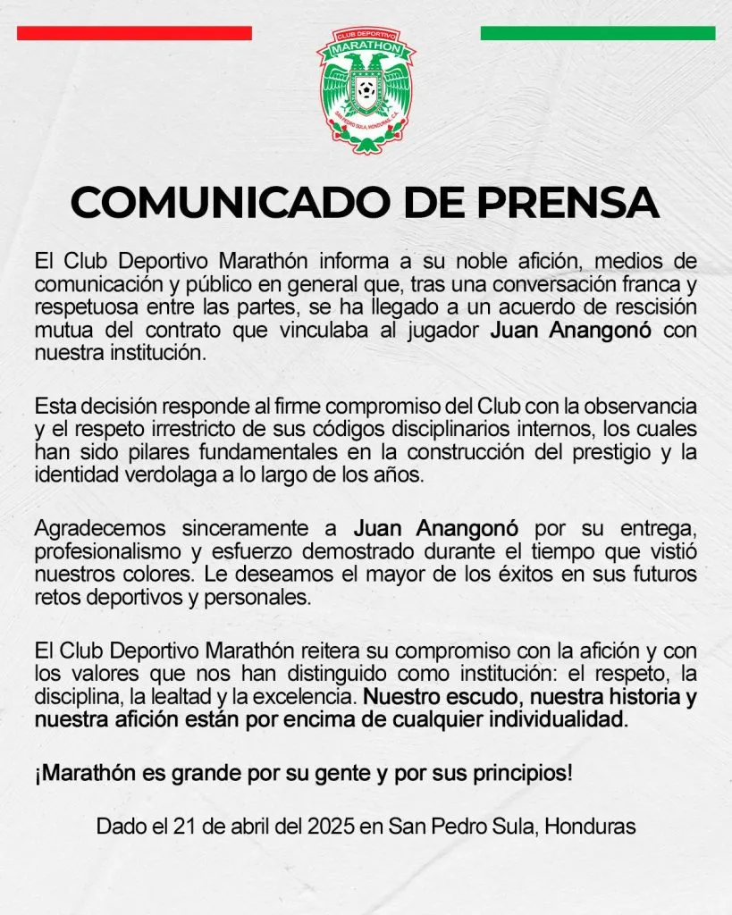 “Se ha llegado a un acuerdo de rescisión mutua del contrato que vinculaba al jugador Juan Anangonó con nuestra institución”.